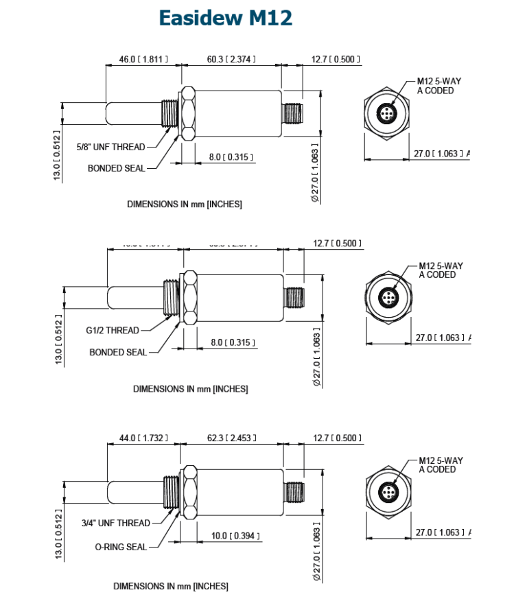 | Mating Electrical Connectors | Mating connector supplied as standard Easidew M12: optional 0.8, 2, 5 metre (2.62, 6.56, 16.4 foot) M12 A coded connector/cable available |