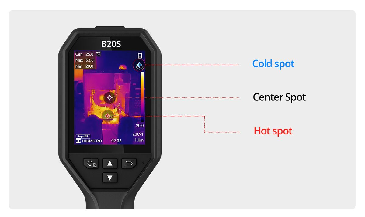 Full-screen Precise and Wide Temperature Measurement – The thermal imaging camera B20 supports the capture of full-screen radiometric images and automatically tracks max/min/center spots to pinpoint temperature anomalies at a glance. It accurately measures temperatures from -20°C to 550°C (-4°F to 1022°F) with a temperature accuracy up to +/-2°C (+/-3.6°F) or +/-2% of reading.