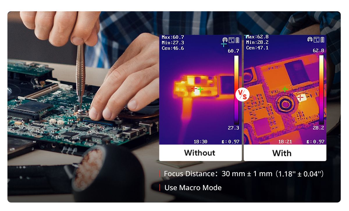 Optional innovative macro mode – Using a clip-on macro lens, the B20S cameras can see details as small as 500 microns and allow you to take accurate temperature readings on small objects, such as components on printed circuit boards or assemblies.