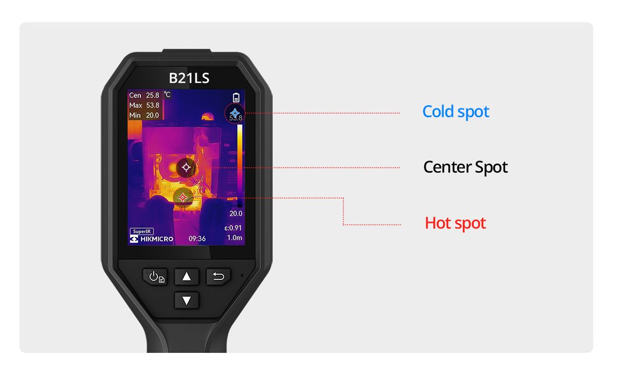 Full-screen Precise and Wide Temperature Measurement – The thermal imaging camera B21LS supports the capture of full-screen radiometric images and automatically tracks max/min/center spots to pinpoint temperature anomalies at a glance. It accurately measures temperatures from -20°C to 550°C (-4°F to 1022°F) with a temperature accuracy up to +/-2°C (+/-3.6°F) or +/-2% of reading.