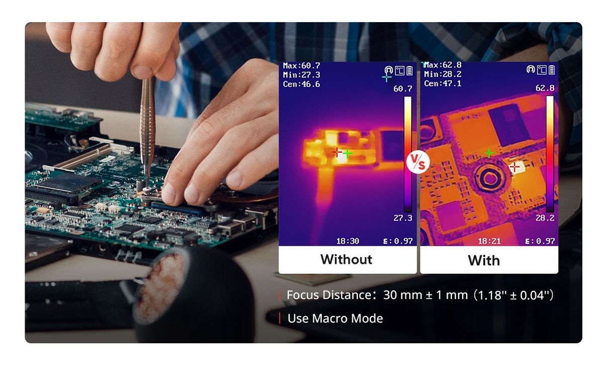 Enhanced Thermal Clarity with SuperIR – HIKMICRO’s SuperIR image enhancement technology upscales the resolution of captured thermal images to 640 x 480 (307,200 pixels), significantly improving thermal image quality. It also provides a smooth 25 Hz image frequency for live viewing and photo capture.