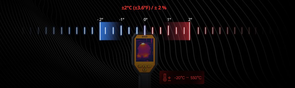 Full-screen Precise and Wide Measurement – Supports capture of full-screen radiometric images and automatically tracks max/min/center spots to pinpoint temperature anomalies at a glance. Accurately measures temperatures from -20°C to 550°C with a temperature accuracy up to +/-2°C or +/-2% of reading.