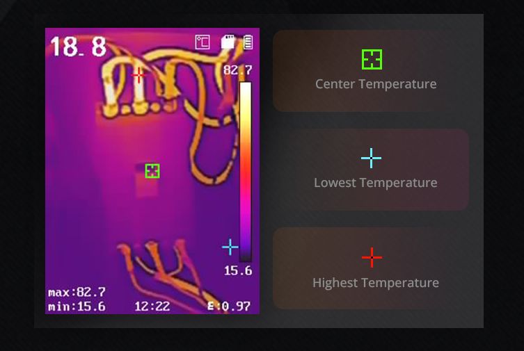 Quick Temperature Measurement – Full screen measurement in virtue of different presets checks everywhere at the very first sight. Measurement Presets: Center Spot, Hot Spot, Cold Spot, Off.