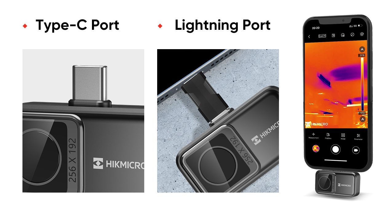 Type-C Port & Lightning Port – HIKIMICRO Mini2 V2 compatible with the latest iPhone 15 series and Android devices. Equipped with Lightning to Type-C adapter suitable for iPhone14 and earlier models.