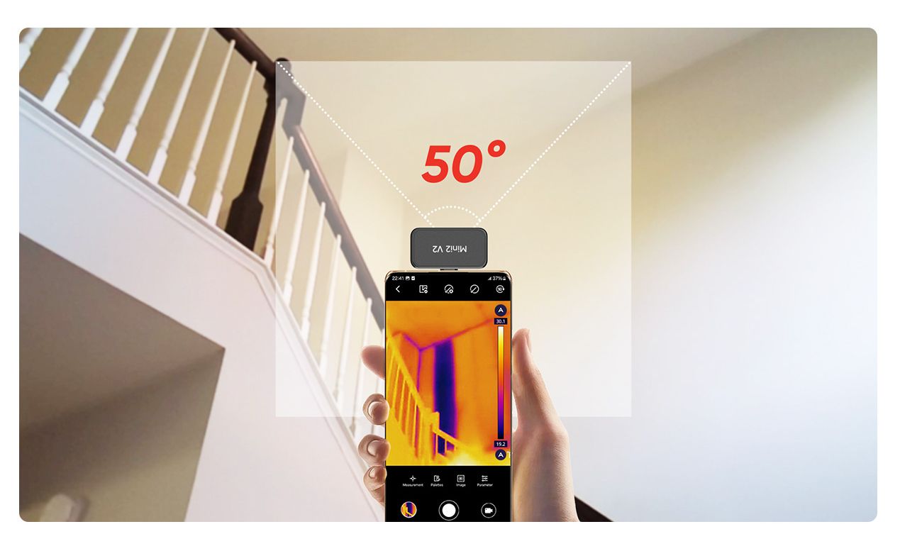Wide Angle – HIKMICRO Mini2 V2 with a 50° wide angle lens provides a large FOV, which is ideal for scanning walls, floors, and facades for finding issues like water leaks, insulation issues, and air infiltration.