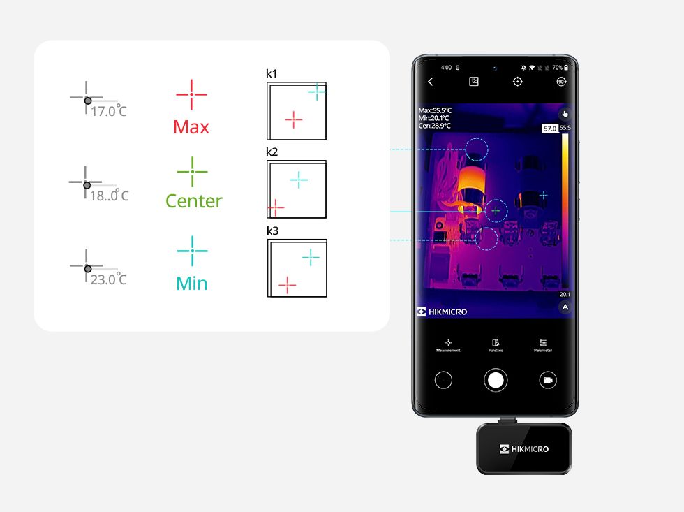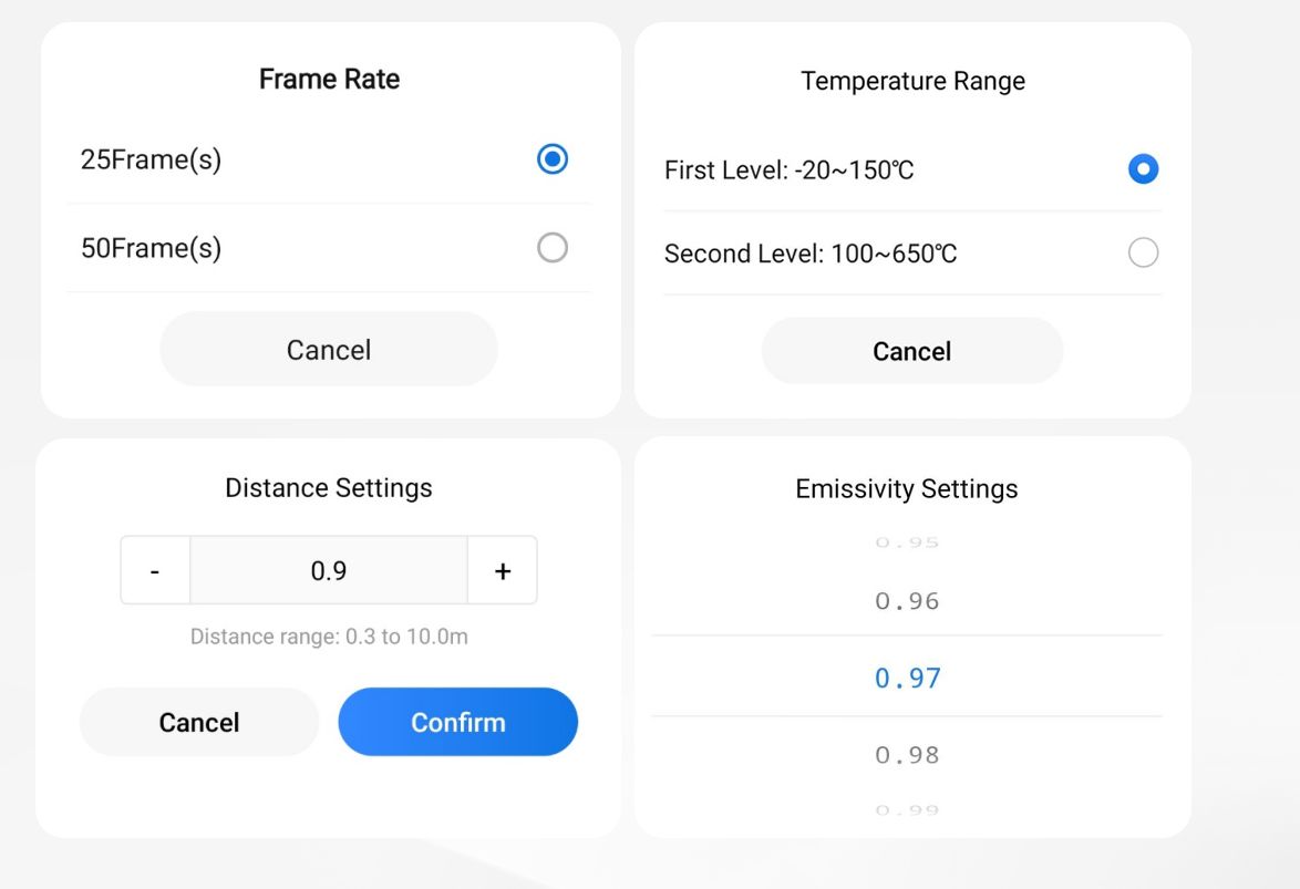 Multiple Professional Settings – Providing professional settings like emissivity/distance/range of your thermal camera allows you to get the best thermal imaging images and temperature readings of different surfaces.