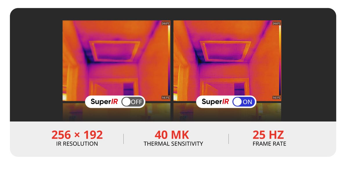 Enhanced Image Quality – The HIKMICRO Pocket2 is designed with a highly sensitive (NETD < 40 mK) VOx detector and features a resolution of 256×192 (49,152) pixels, ensuring exceptional image quality. With a fast image frequency of 25 Hz and advanced real-time SuperIR image enhancement algorithms, this device delivers a clear and detailed thermal view.