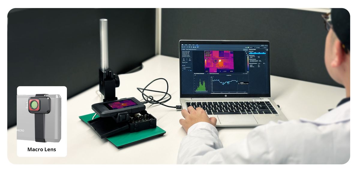 Innovative Macro Mode – Using an extra clip-on macro lens and desk stand bracket, the Pocket2 thermal camera can see details as small as 100 microns stably and take accurate temperature readings on small objects, such as components on printed circuit boards or assemblies.