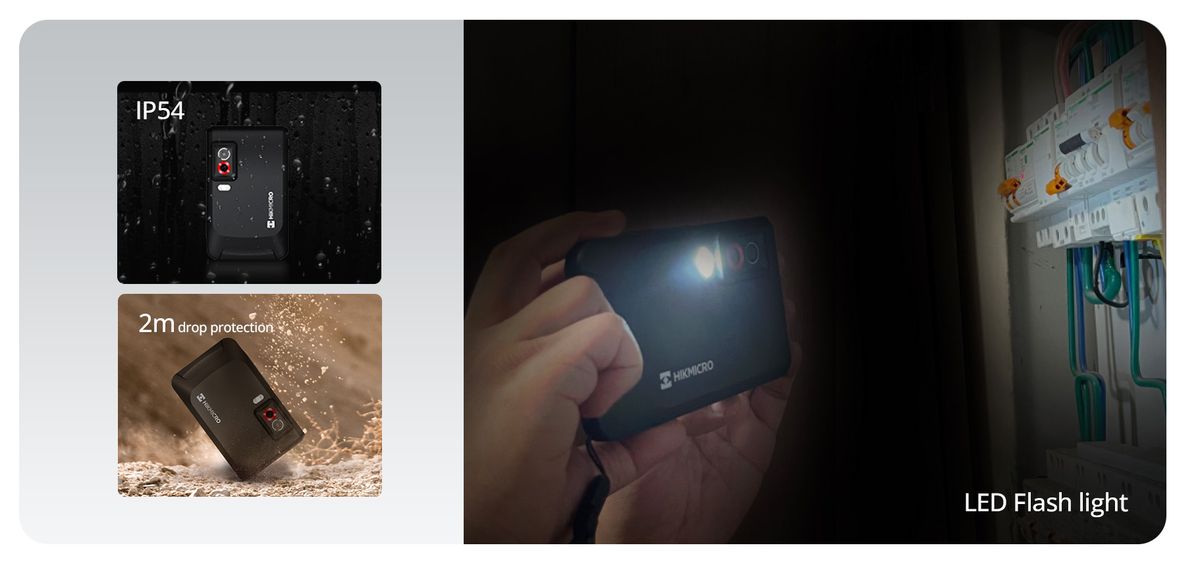 Reliable in harsh situations – The HIKMICRO Pocket2 offers worry-free usage in tough environments thanks to its IP54 rating, which provides ample protection against dust and splashing water, as well as its ability to withstand drops of up to 2 meters. A built-in LED flashlight allows users to easily work in low-light conditions, record thermal readings, and capture high-quality digital images without the need for an additional light source.