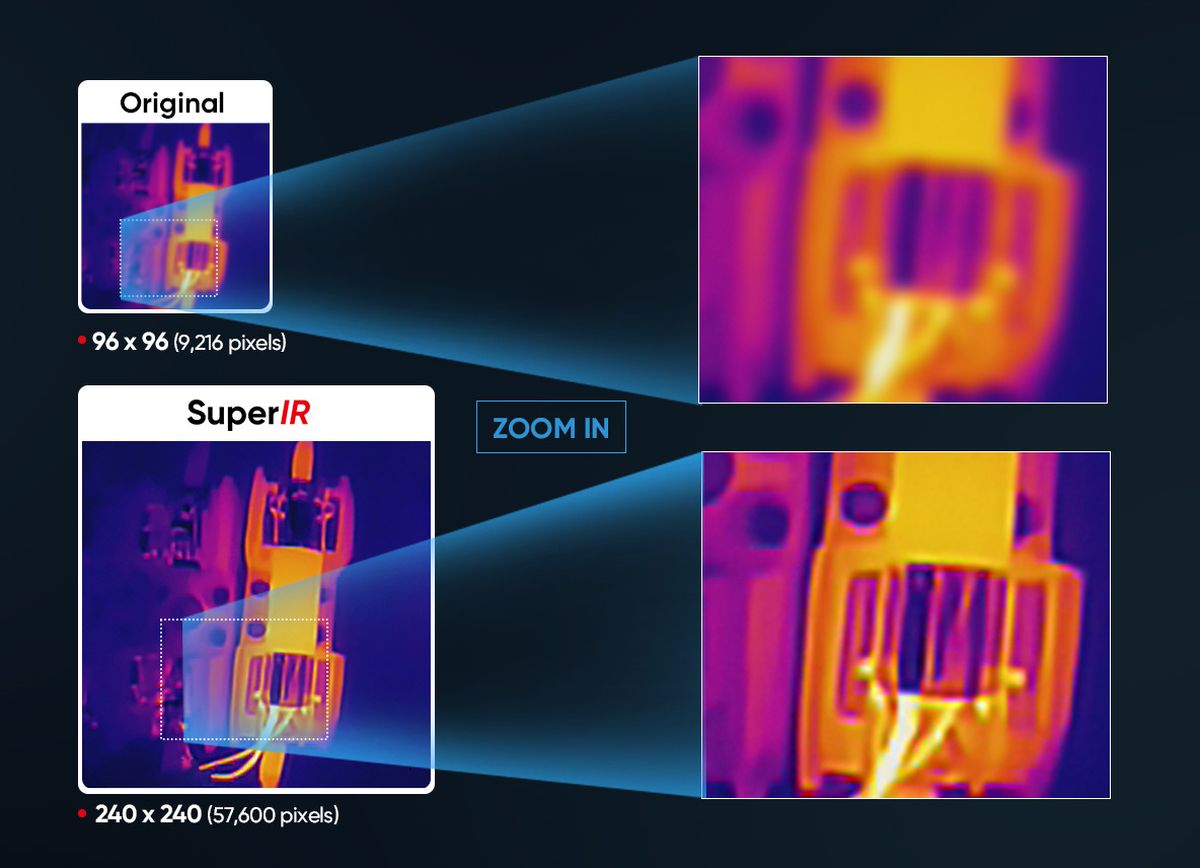 Enhanced Thermal Clarity with SuperIR – Powered by HIKMICRO SuperIR image enhancement technology, it upscales thermal images from 96 × 96 (9,216 pixels) to 240 x 240 (57,600 pixels) resolution when viewing live with 25 Hz fast image frequency and capturing photos.