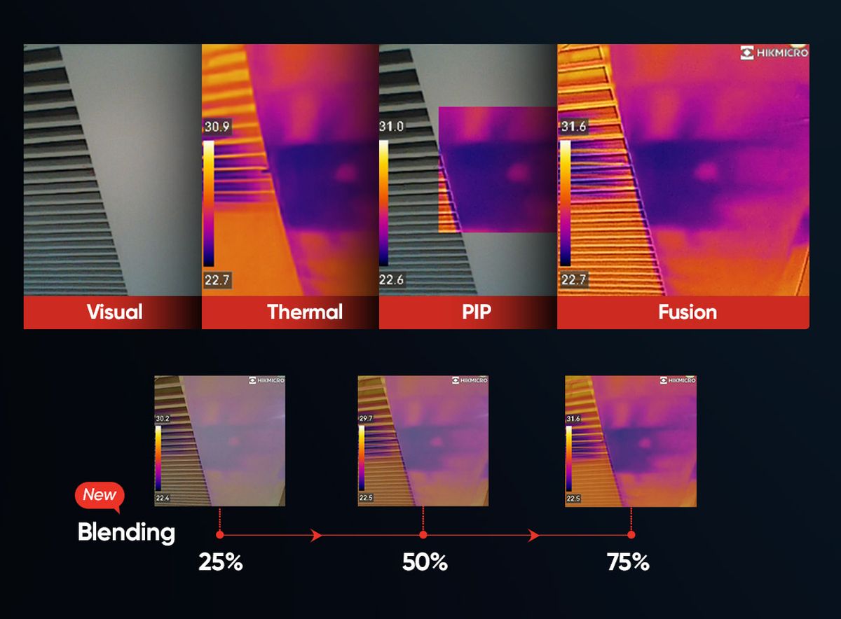 Dual-camera Thermal Imager – Built-in IR camera and visible camera, allow you to switch 5 image modes (Thermal, Visual, PIP, Fusion, and Blending). “Fusion” blends key details from a 0.3M Pixels visual camera to the IR image, adding extra detail and clarity. “Blending” blends partially transparent infrared and visible images into a single view and allows you to adjust the transparency. “PIP” overlays a fixed section of a thermal image onto a digital photo to clarify anomaly locations.