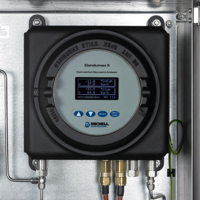 The Condumax II hydrocarbon and water dew-point analyzer provides continuous, automatic measurements of these two critical parameters of natural gas quality. It uses the ‘Dark Spot’ direct chilled-mirror technique to measure hydrocarbon dew point with high accuracy and long-term reliability. Water dew point measurements are provided by Michell’s Ceramic Metal-Oxide Moisture Sensor.