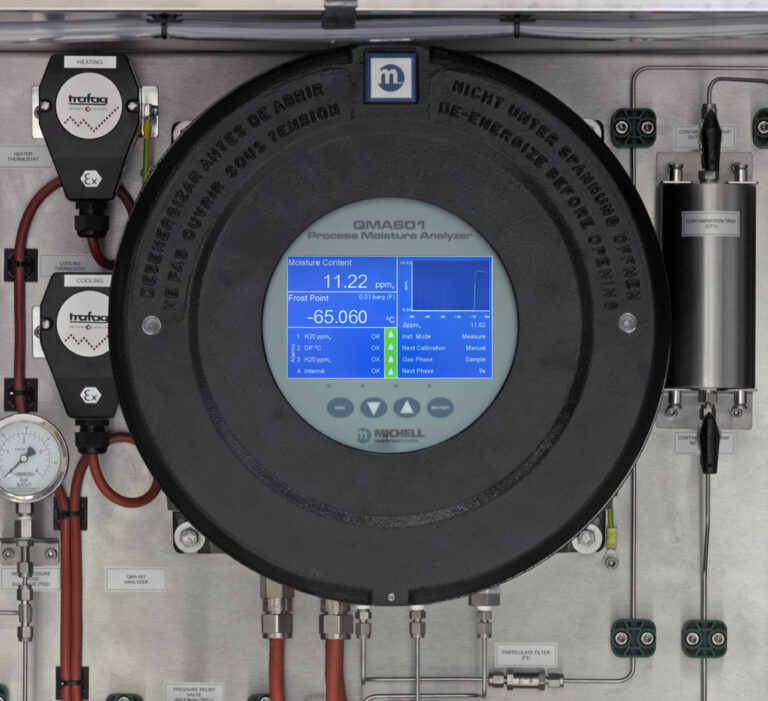 The QMA601 Process Moisture Analyzer provides highly reliable, fast and accurate measurement of moisture content in a wide variety of carrier gases. It has a lower detection limit of 0.1 ppmV with reliable accuracy at sub-ppm trace moisture levels. Using Michell’s latest developments in Quartz Crystal Microbalance technology the analyzer measures moisture levels effectively even in gases with changing background compositions. It is fully certified for use in hazardous areas.