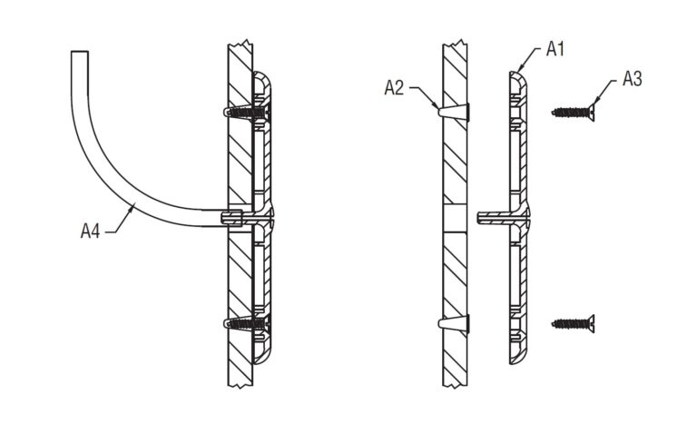 Installation: Wall mounting: Mounts on the wall next to the door inside the room at 5 feet height or on the ceiling tile inside the room. Minimum wall depth required: 2 inches. Includes mounting plate (A1), anchors (A2), and screws (A3) for installation. The sensor features a fitting for connecting plastic tubing (A4) from the kit to the measurement instrument.